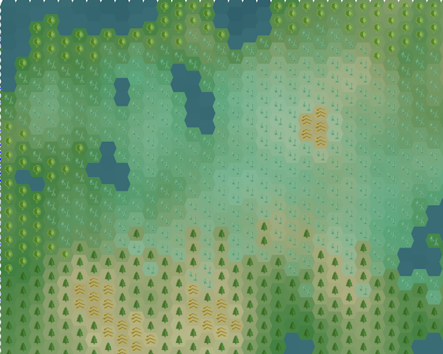 With the bulk of the terrain generation under my belt, I spent some time working on the visual presentation of the hex map. I feel that the maps were looking too clunky and cluttered, with too many terrain icons. Since I had a fully detailed elevation map at my disposal, why not use that to create nice looking gradient terrain hexes, rather than relying on terrain icons to represent everything? I kept terrain icons for areas of high mountains and heavy forests, but the nice gradient of hex colors now presents a pleasing aesthetic to the map.